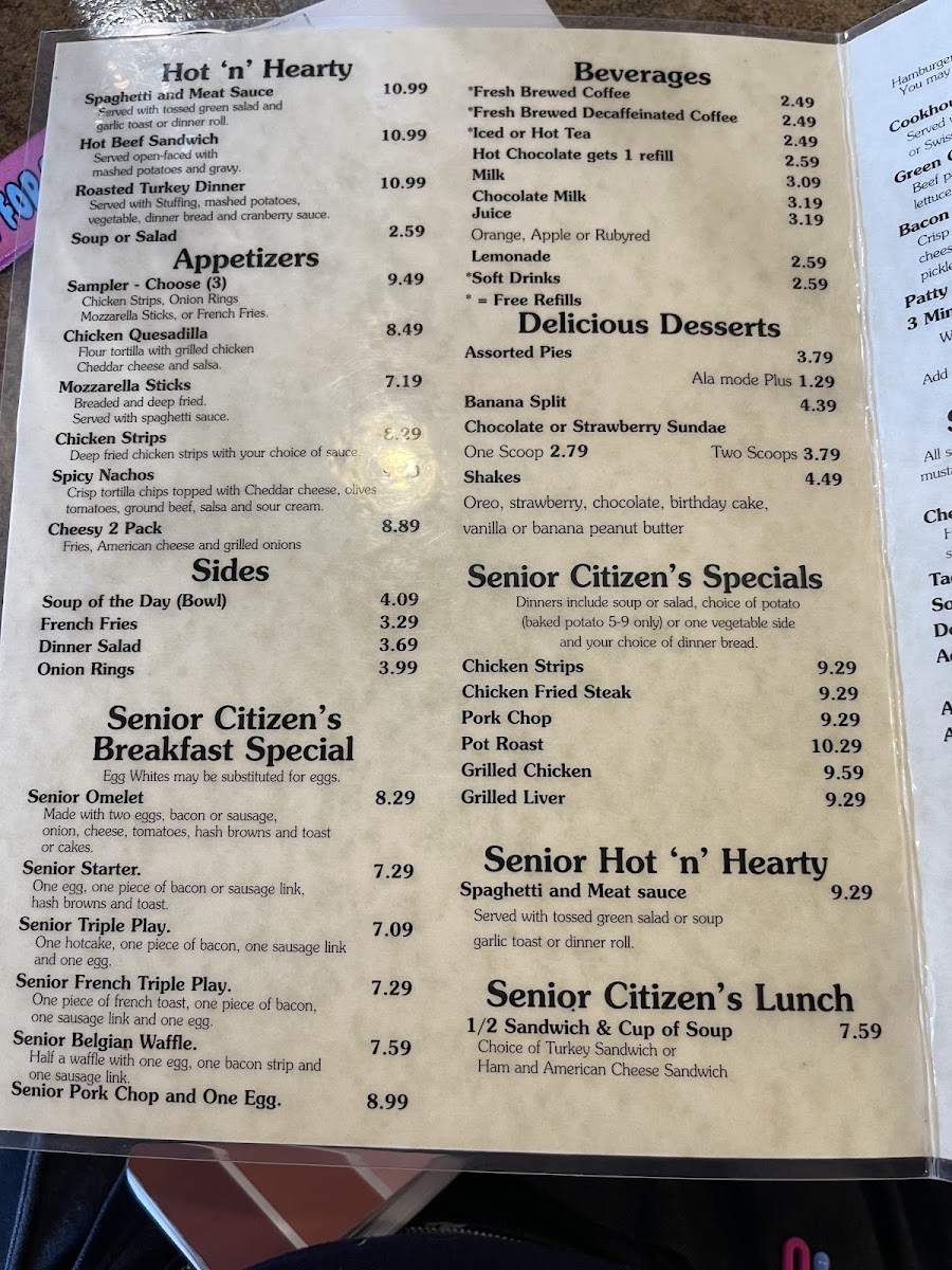The breakfast options are particularly inviting, featuring enticing side orders like crispy 4 bacon strips and hash brown potatoes. For those dining with kids, the Jr Fries are a perfect side. Seniors can enjoy a comforting 1/2 sandwich with a cup of soup for a delightful lunch experience.